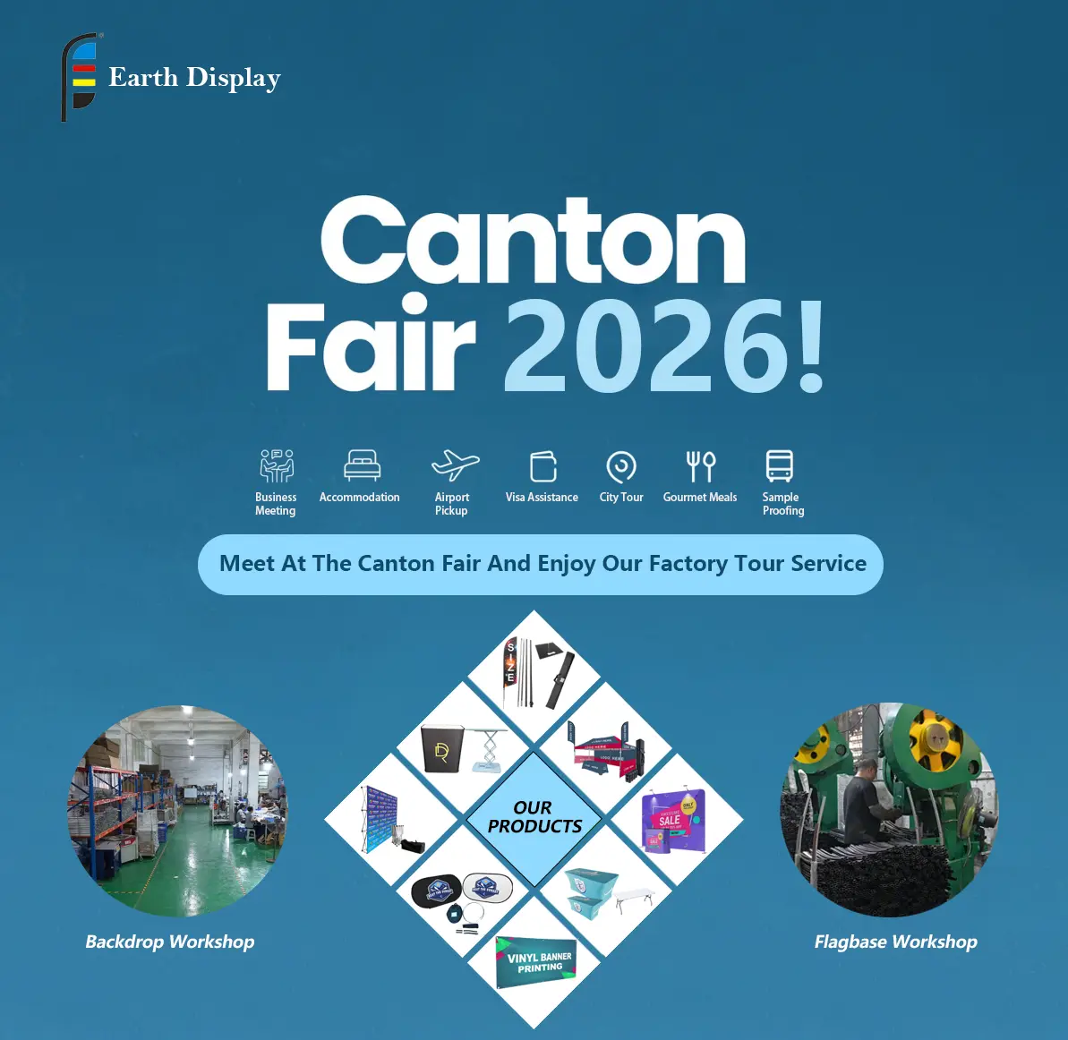 Canton Fair 2026 nærmer sig, og vi på Earth Display håber virkelig at se dig der. Vi har lavet fjerflag, pop-up-baggrunde, flagbaser, tilpassede vinylbannere – stort set alt til udstillinger og annoncer – i over ti år nu. Denne gang vil vi, i stedet for bare at tale online, vise dig, hvad vi laver, ansigt til ansigt.